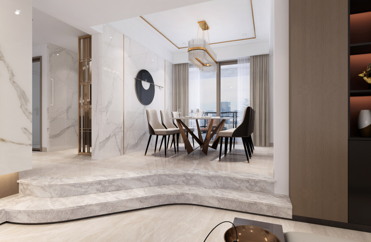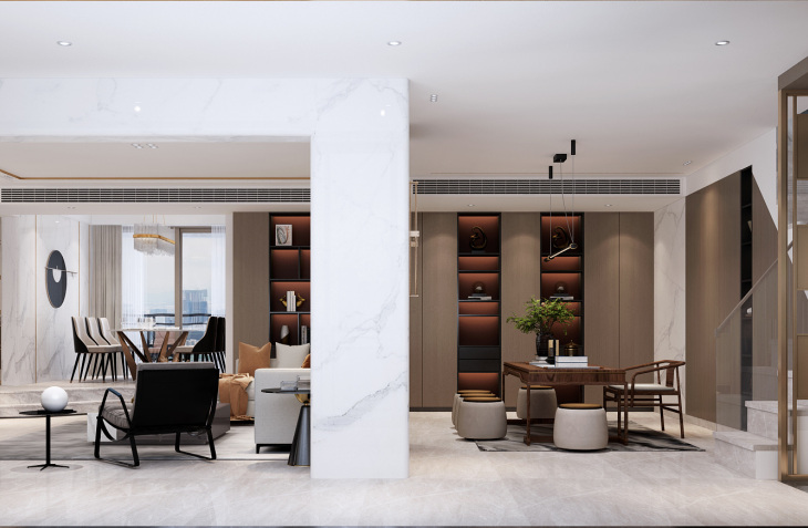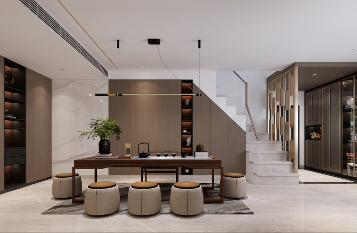 设计说明:此项目委托设计的是一对有两个小孩的夫妻,业主希望满足房屋收纳的,所以整个空间考虑了收纳的空间。 因为本案属于一个毛坯房改造,将原有的空间结 构进行了合理的一些梳理及重组,保留客餐厅常规布局的同时,将沙发后面一间客房改造成会客的茶室,即满足了会客的需求也生活更多精彩,并且和客厅相连使整个空间更宽敞、贯通,扩大家 居空间,同时将大平层设计的室内感受做到极 致,将阳台纳入到客厅区域,通过结构造型及整个空间的地面墙面天花的色调的关系,达到连续性和统一性。在餐厅与多功能室交接墙上做 满墙灯光设计,通过对灯光对控制,满足空间温馨 和定调的同时将两个空间的氛围提升了不少趣味 性, ■为保持设计简练洁净的质感,全屋采用无主灯设 计,不同功能下的点光源设计为照明带来了更多层 次感